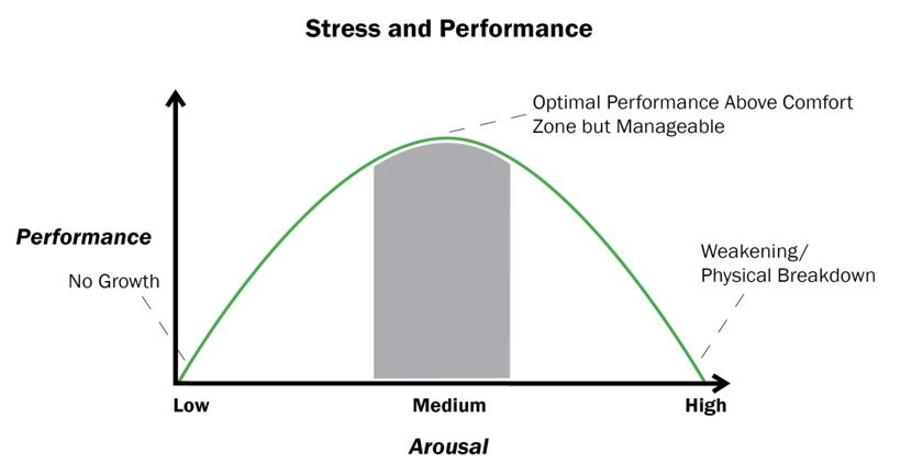 Optimal stress is considered good stress – it allows you to be in the “Zone.” R2MR does a good job illustrating optimal stress and performance: