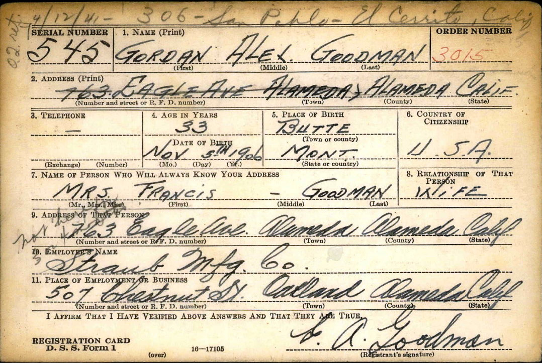 US World War II Draft Registration Card; Gordon Alexander Goodman, October 1940