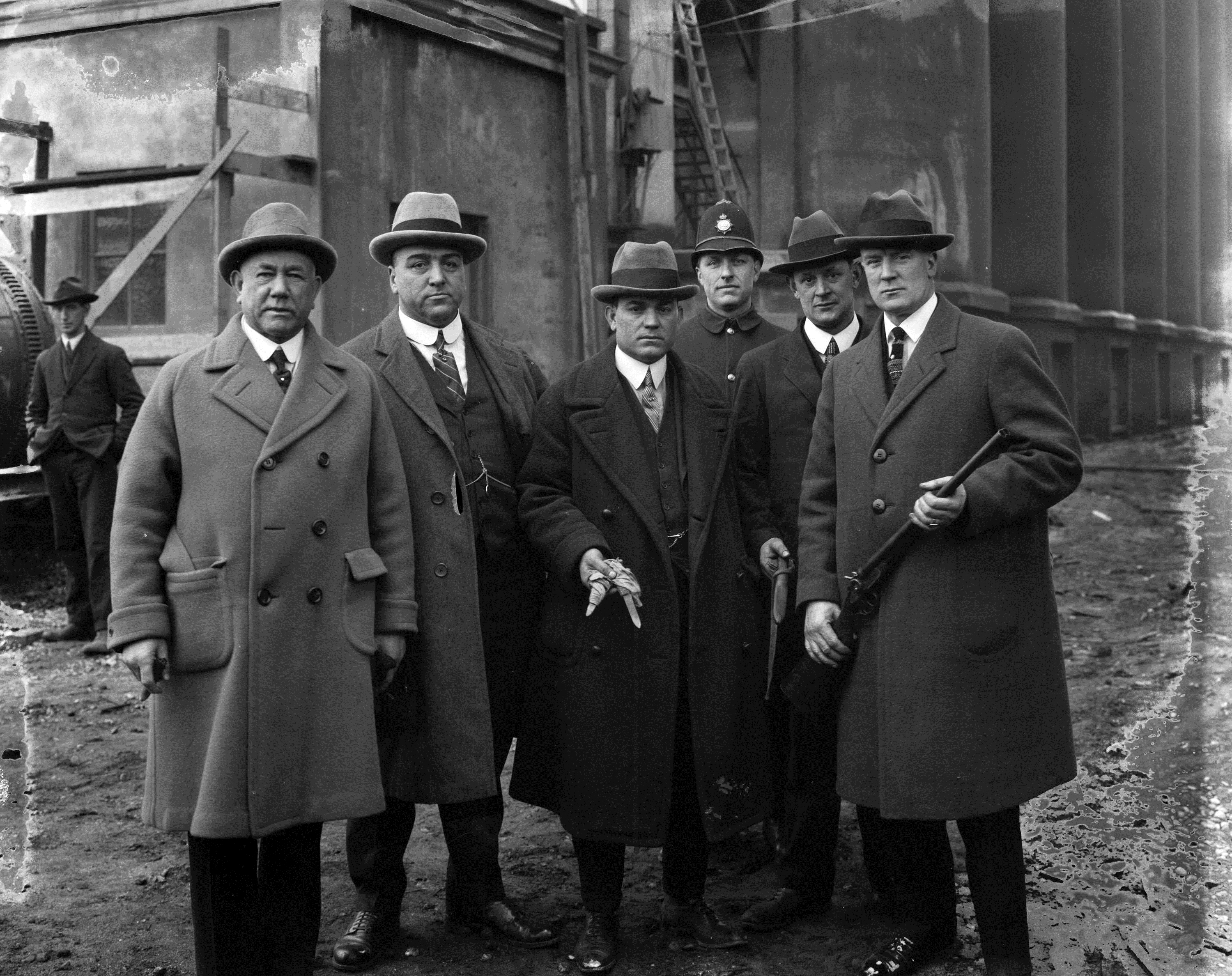 January 1924 – Police show off weapons after a murder. L to R: Inspector John Jackson, Detectives Jack Killeen, Joe Ricci, Donald Sinclair and Detective Sergeant George McLaughlin (Constable Duncan Johnston in uniform). CVA 99-3470
